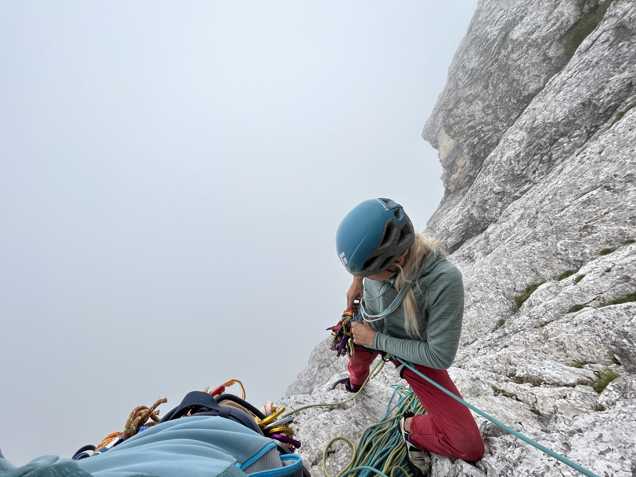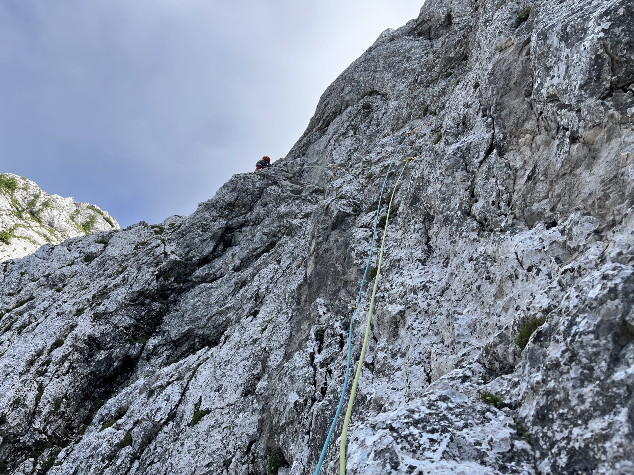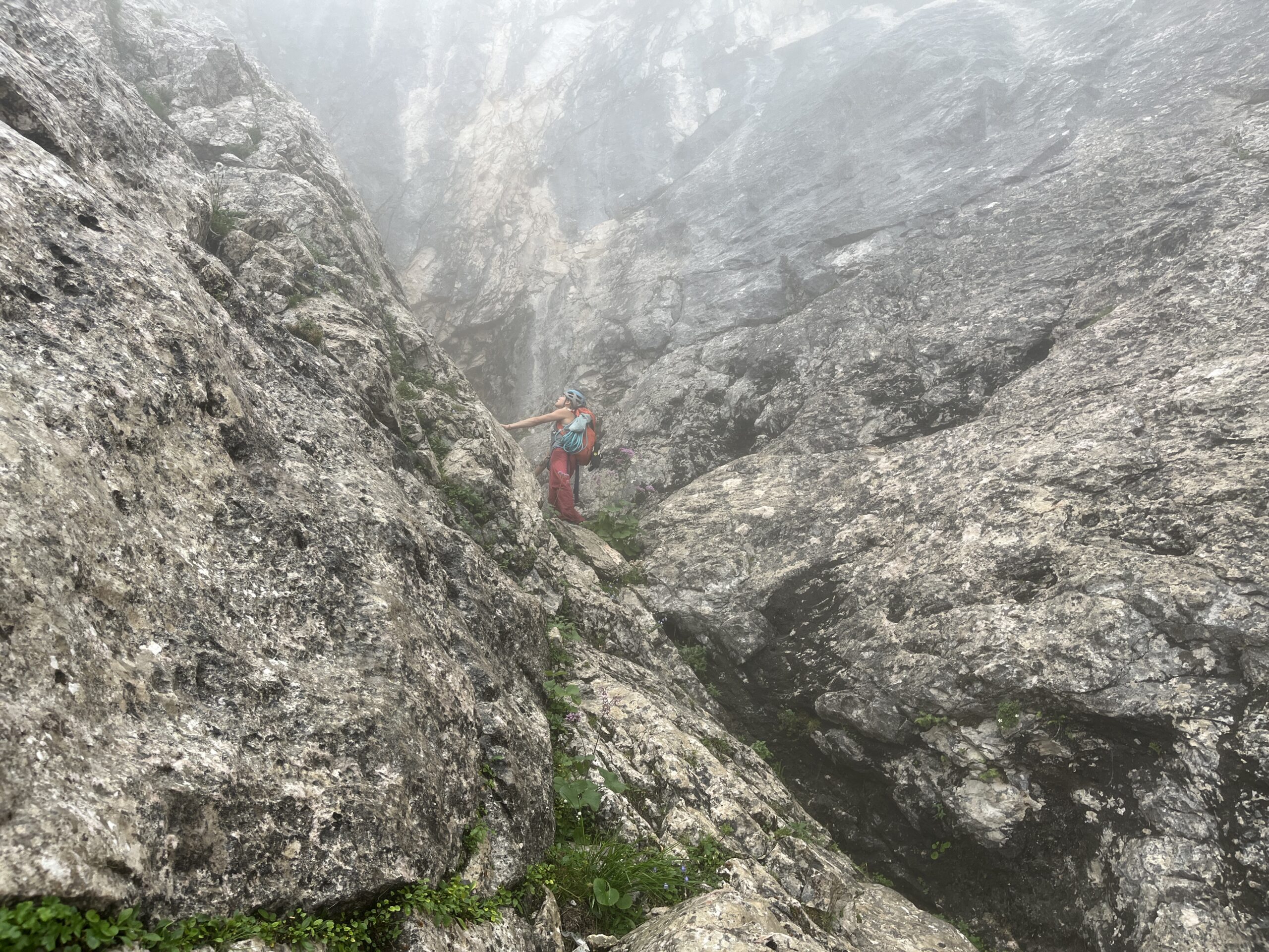 Z Niko sva se v torek zgodaj zjutraj prebudili v totalno megleno Krmo. Z namenom, da splezave Sekločevo smer V+, IV+, 250 m (cela stena 400 m). Glede na to, da v severni steni Debele peči ni še nobena od naju plezala in glede na to, da je bila megla do tal iz katere je zapovrh še rosilo, ni izgledalo nič kaj obetavno. Pa vendar. Vseeno sva se odpravili pod steno. Ko sva se po lovski poti dvigali skozi gozd, so tekli pogovori o tem, ali bova v tej megli sploh našli vstop v smer. Kajti ta se začne kar visoko in te do vstopa čaka najprej 100 m poplezavanja po lažjih prehodih do kotanje. Tu je največji orientir velika zajeda, ki pa je seveda nisva videli. Nekako poizkusive slediti opisu ter pribljižno uhojenem terenu in se po nekaj spraševanjih vmes, ali gre to tam kjer treba, kar naenkrat znajdeve pod ogromno zajedo. Z mojo dioptrijo sem morala še 2 x pogledati skozi gosto meglo ali je to res to. Obe veseli in mokri do kolen in še čez, se podave v vlažen prvi cug v upanju, da se megla razkadi in skala malo bolj posuši. No, megla celo Sekločevo ni popustila, skala pa je v težjih delih postala popolnoma suha. Smer je zelo sledljiva, plezarija pa super in v zaporednih peticah kar konkretna. Sekločeva smer se nato priključi smeri Jesih-Potočnik, kjer zanimivost raztežajev sploh še ne popusti. Ne opisujejo zastonj v poročilih, da do vrha stene preplezaš še najlepše raztežaje te smeri. Zaključna dva raztežaja še kar dobro poplezaš. Najlepša stvar zadnjih raztežajev pa je bila ta, da se je megla razkadila in sva bili do konca deležni samo še sončka. Nato pa še dolg sestop po grapi, čez nekaj skalnih skokov po lovski poti, kjer se nama je na vsake toliko časa sled zabrisala in sva imeli nekaj orientacijskih ugank.